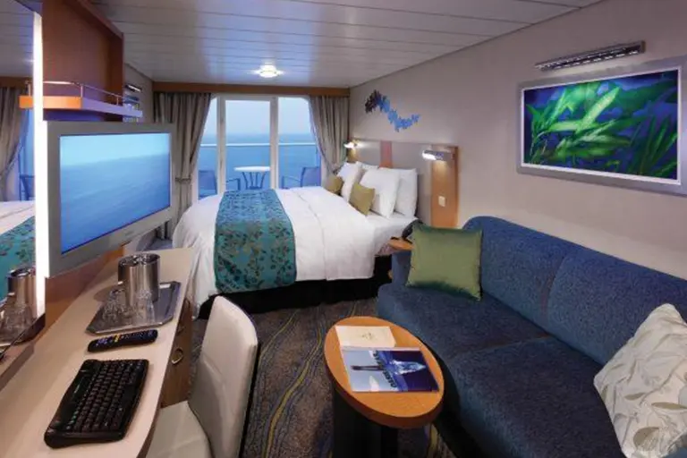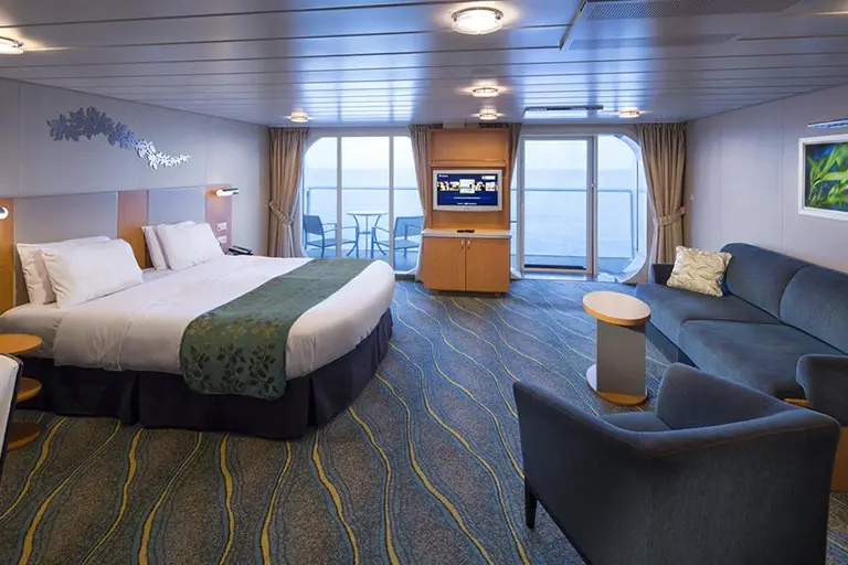 Two-decks-high stateroom with panoramic views. Master bedroom with Royal King size bed and bath on second level. Bath with shower on main level. Private balcony with chairs, dining area with dry bar, table/desk. Living room sofa converts to double bed.